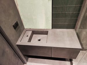 Элегантная тумба с фасадами из бетона, покрытыми лаком для надежной защиты от пятен и легкого ухода. Внутренняя отделка выполнена из шпона светлого дерева (береза) под лаком, создавая теплый контраст с внешним дизайном.